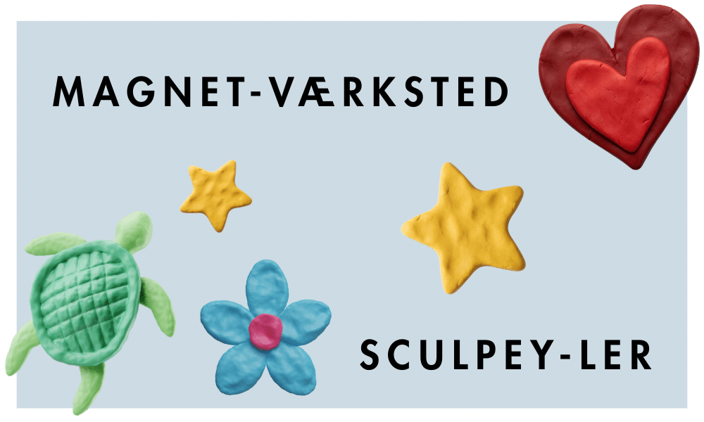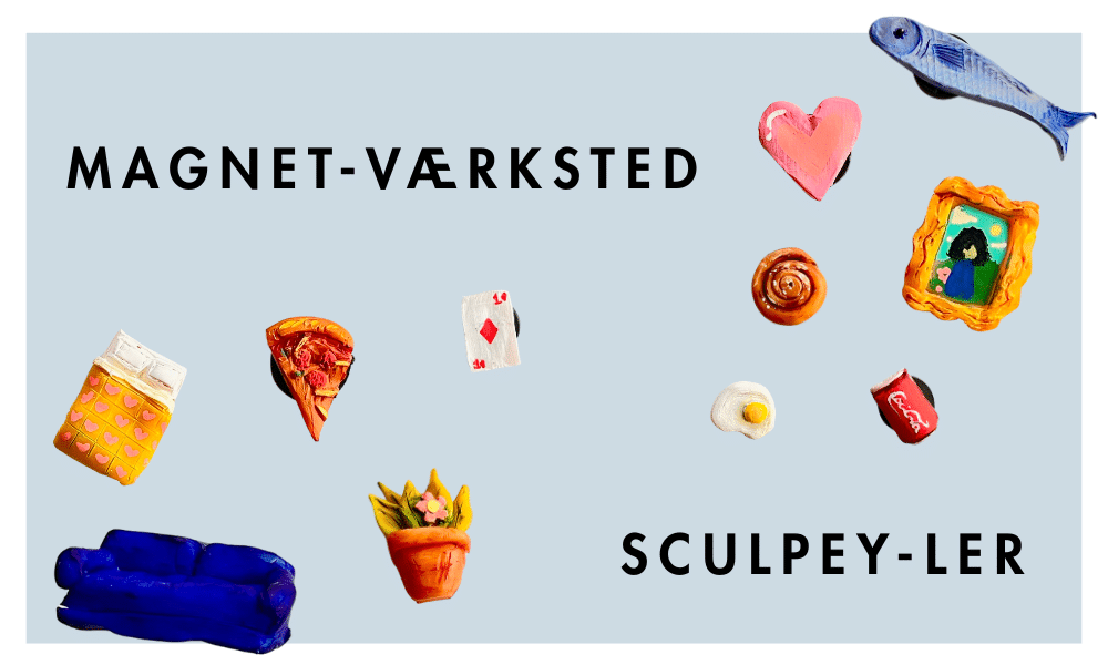 Kun fantasien sætter grænser, når vi former de små detaljer og forvandler dem til flotte magneter, du kan tage med hjem. Da Sculpey-ler skal bages, kan man imens tegne eller hygge sig med andre ting i Billedskolen.